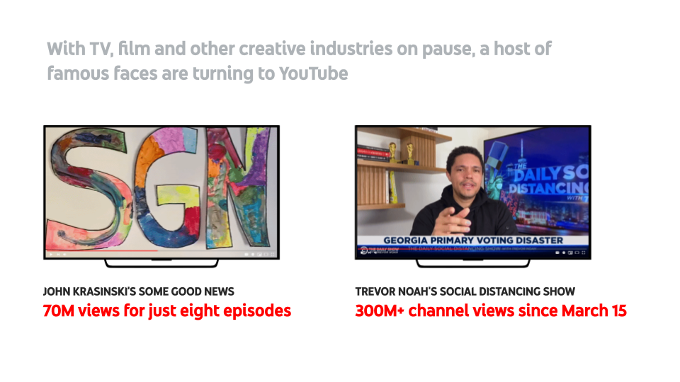 Late night hosts, unable to tape in their studios, became fully native YouTubers, recording from their kitchens and living rooms while feeling more relatable than ever. Trevor Noah completely transformed his show to be produced remotely as people sheltered in their homes.