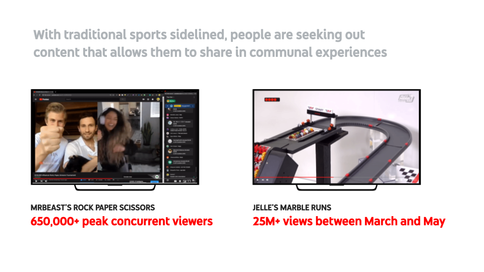 With traditional sports sidelined, people also sought out a range of content that, to some degree at least, filled the void left by the loss of these communal cultural experiences. MrBeast’s live-streamed rock paper scissors tournament was a creative twist on collaboration by creators who were not able to physically meet. Another similarly quirky sports entertainment – marble racing as an Olympic sport – caught on in March. By May, John Oliver had decided to sponsor Jelle's Marble Run's elaborate spectacles and the channel has since passed one million subscribers.