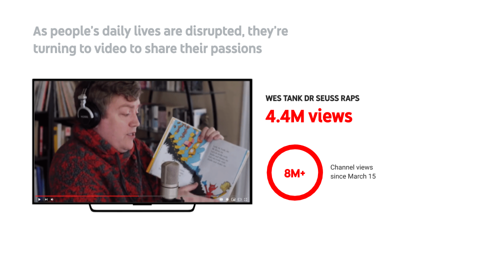 When performers could no longer come together to create music, they united over video instead. These collaborative videos allowed people who are part of choirs to continue to harmonize through the computer. Since March 15th, over 1,500 videos with “virtual choir” in the title have been uploaded globally. Meanwhile, with churches unable to open their doors to their congregations, YouTube allowed viewers to maintain a connection to those institutions. More than 30% of the most-viewed live streams in the U.S. on Easter were religious live streams.
